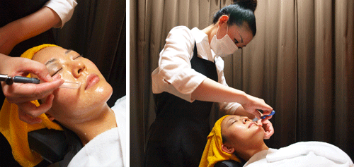 個室風空間ですので非常にリラックスしてご堪能頂けます。まずはシェービング。うぶ毛を剃ることでベールが1枚はがれた感じになり、ワントーンお肌が明るくなります。その後、WAGOオリジナルのクリームを使用し、丁寧にフェイシャルマッサージを行います。